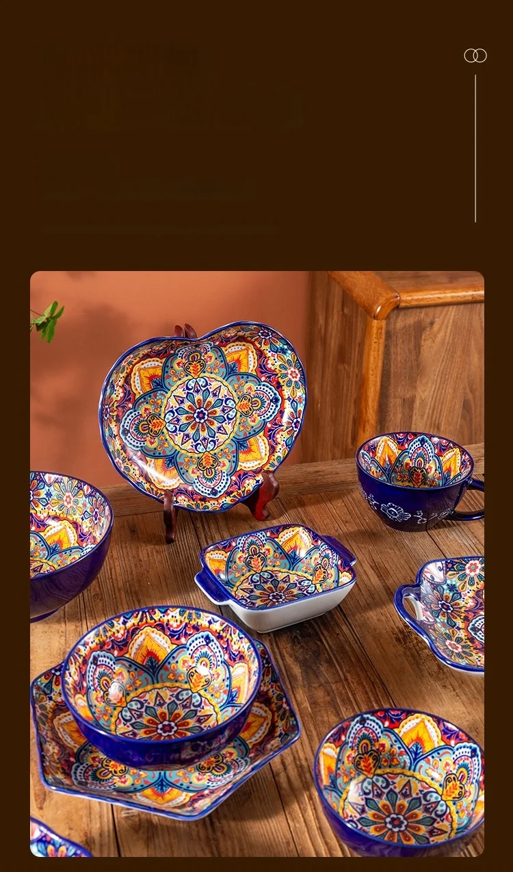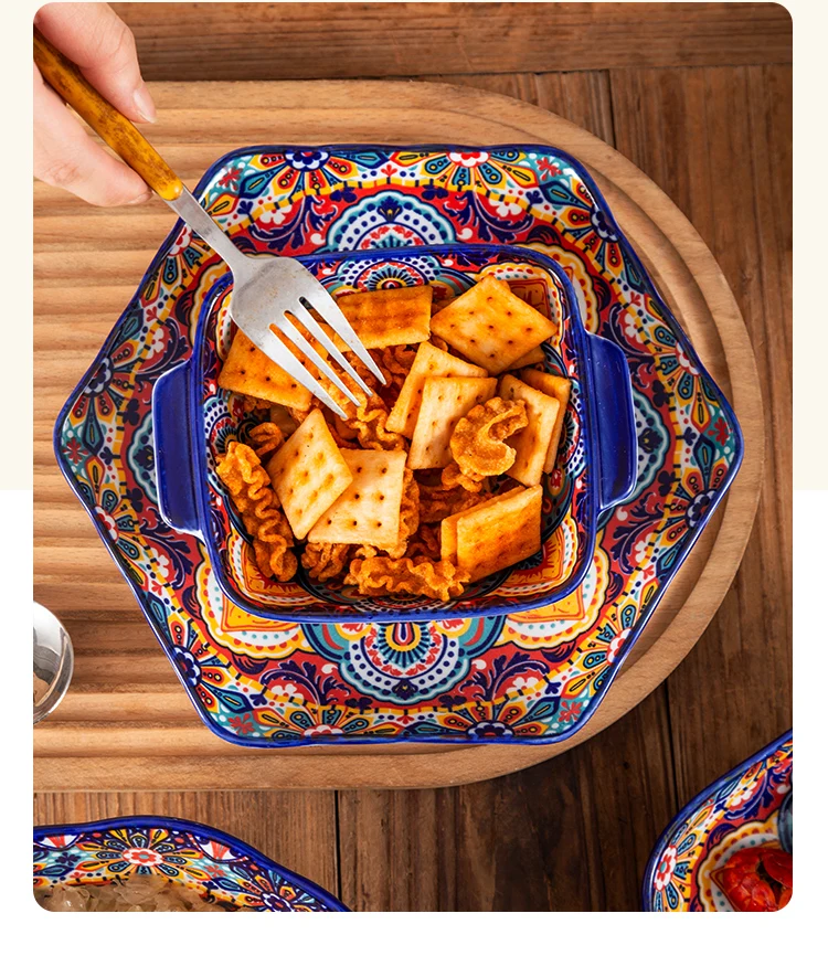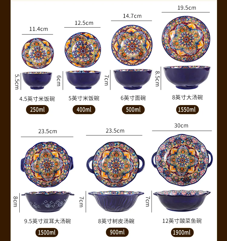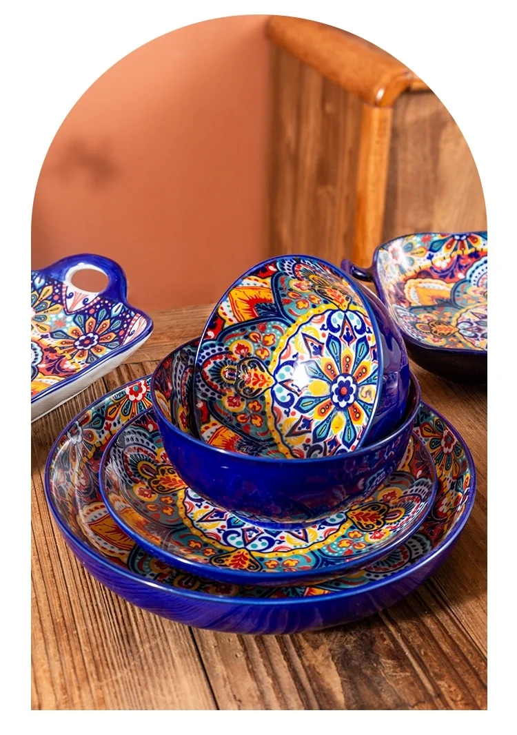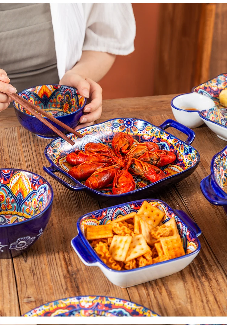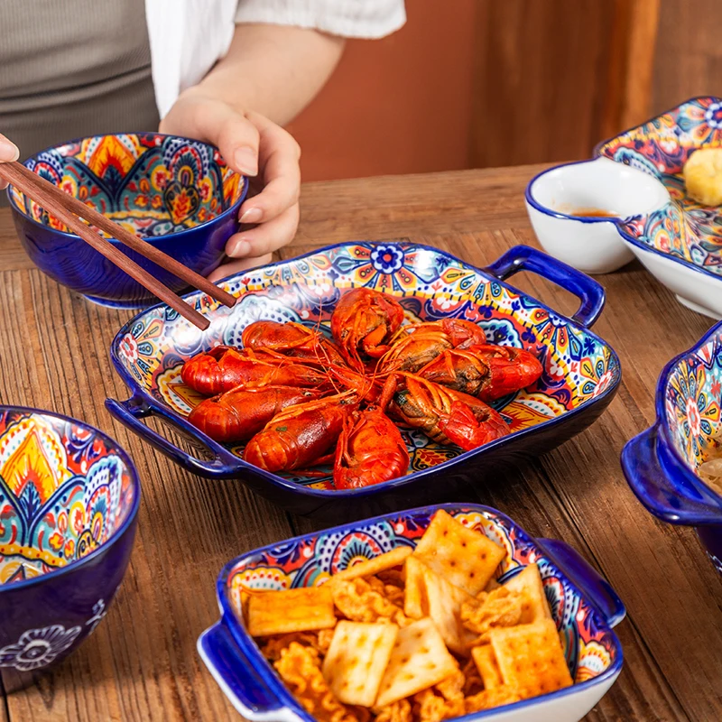 طقم أطباق وأطباق من السيراميك البوهيمي، أوعية شوربة المعكرونة والأرز، مجموعة أدوات مائدة مزدوجة الأذن لتناول الطعام في المنزل