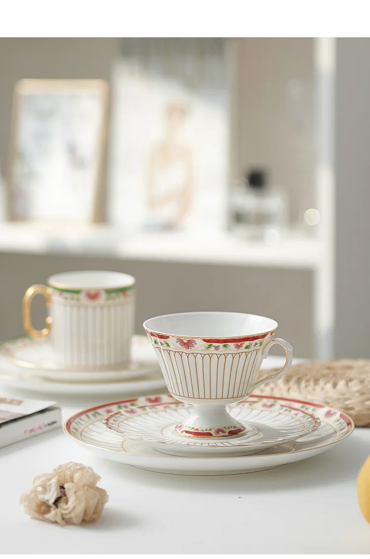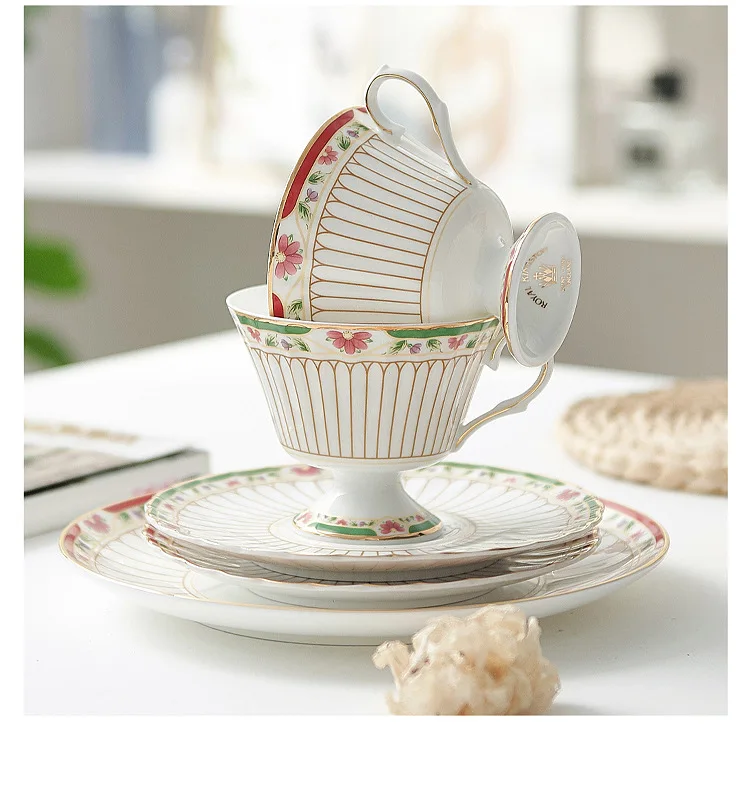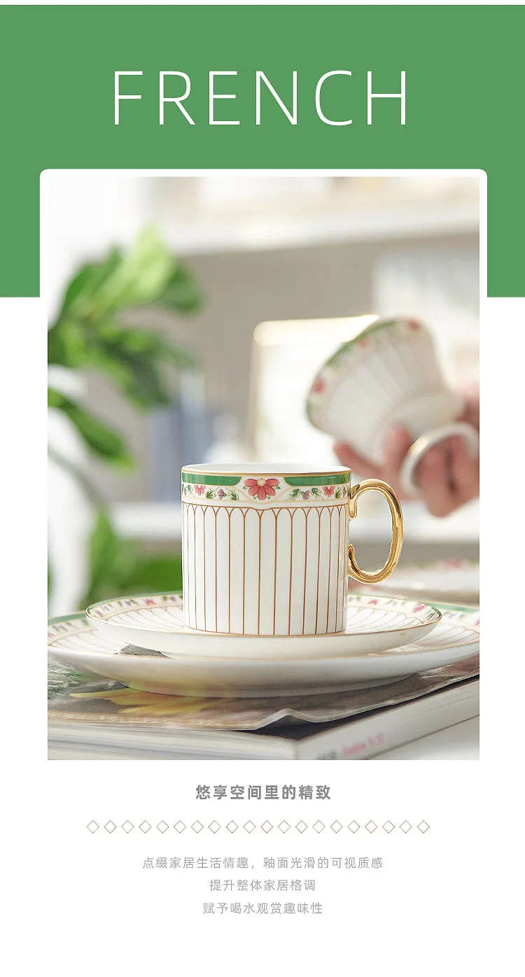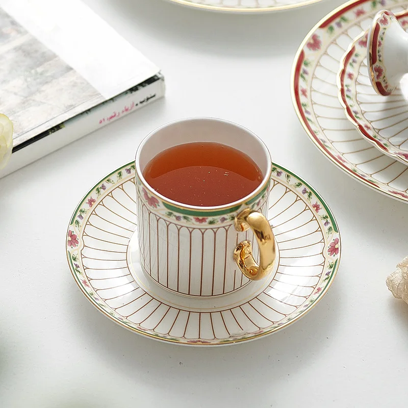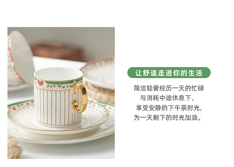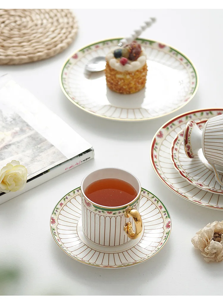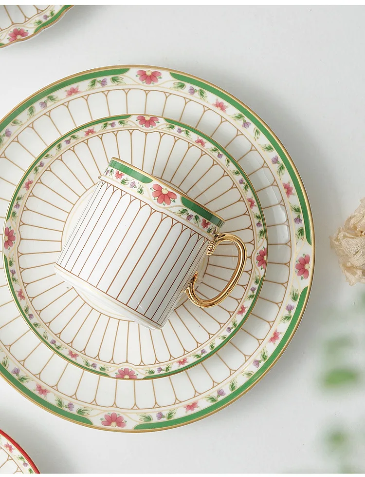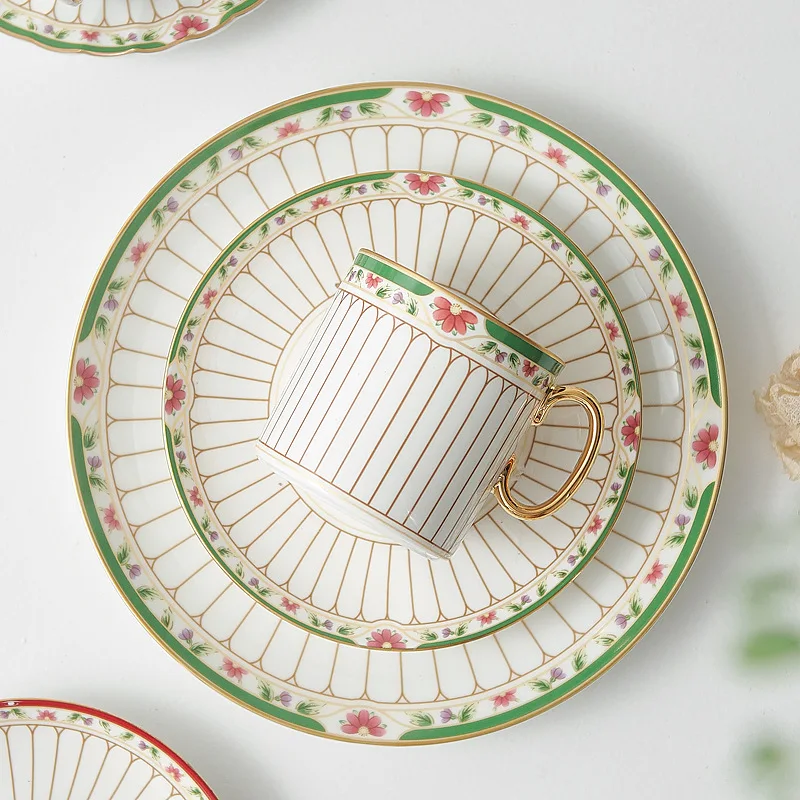 طقم أواني شاي سيراميك مخططة بالزهور، أدوات مائدة بحافة خضراء ذهبية، كوب شاي قهوة منزلي أنيق هدية للاستخدام اليومي