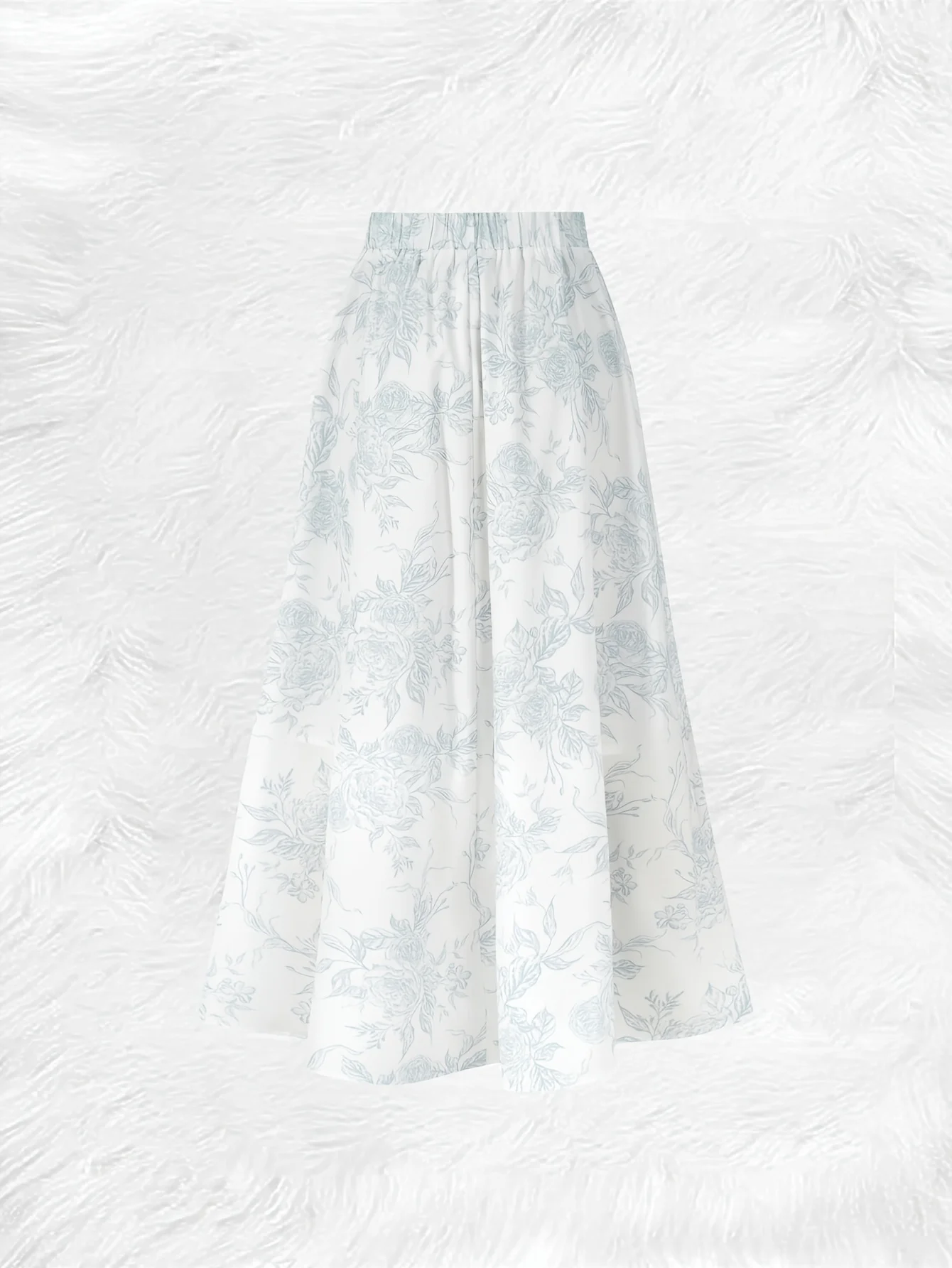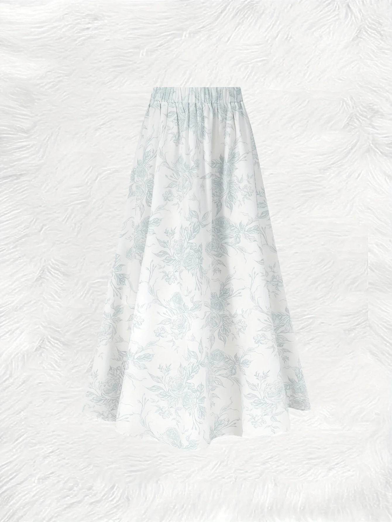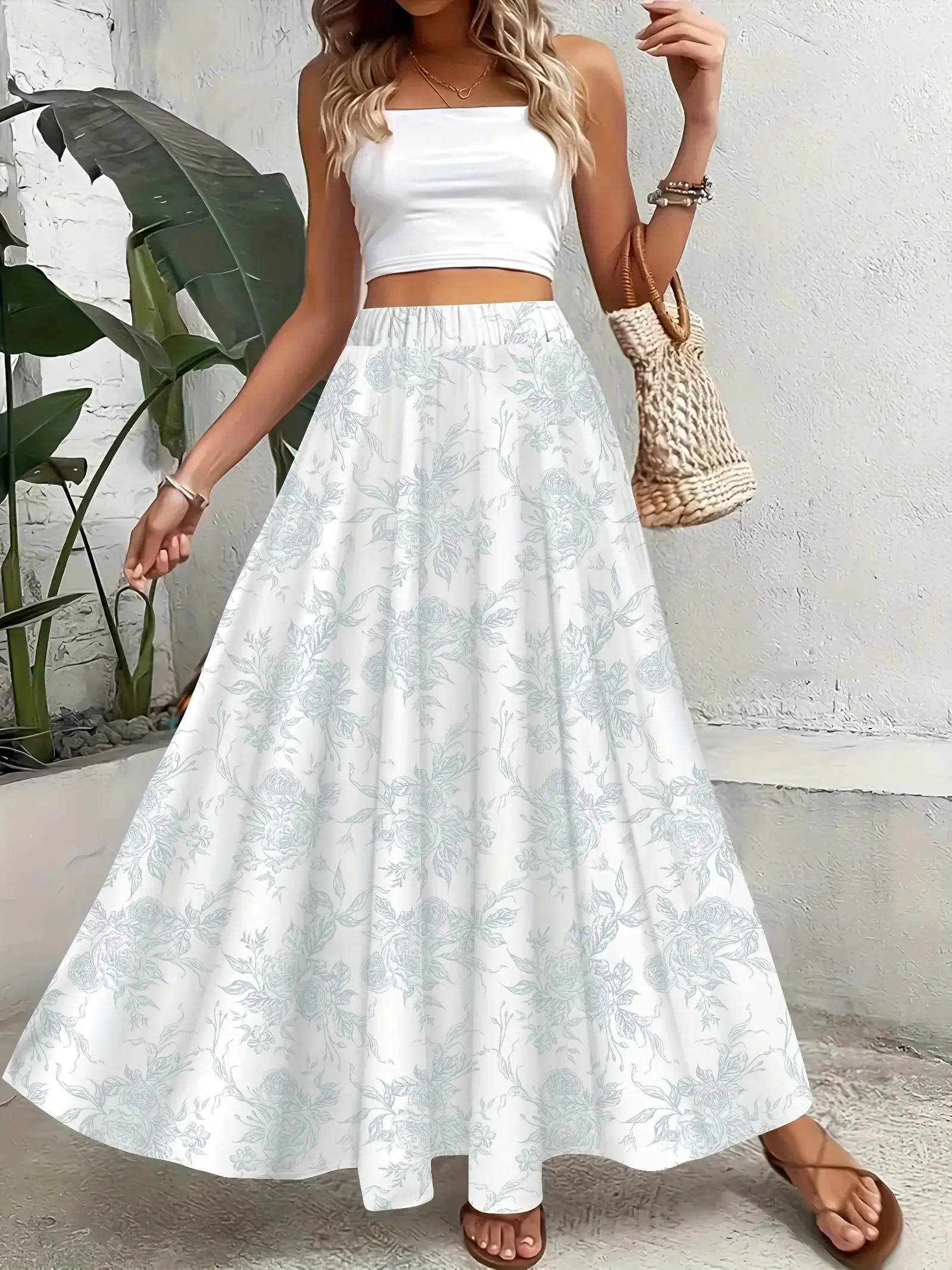 تنورة ماكسي نسائية بتصميم مطبوع أزرق فاتح بنقشة زهور، تنورة نصفية كاجوال بخصر مطاطي على شكل حرف A لجميع المواسم