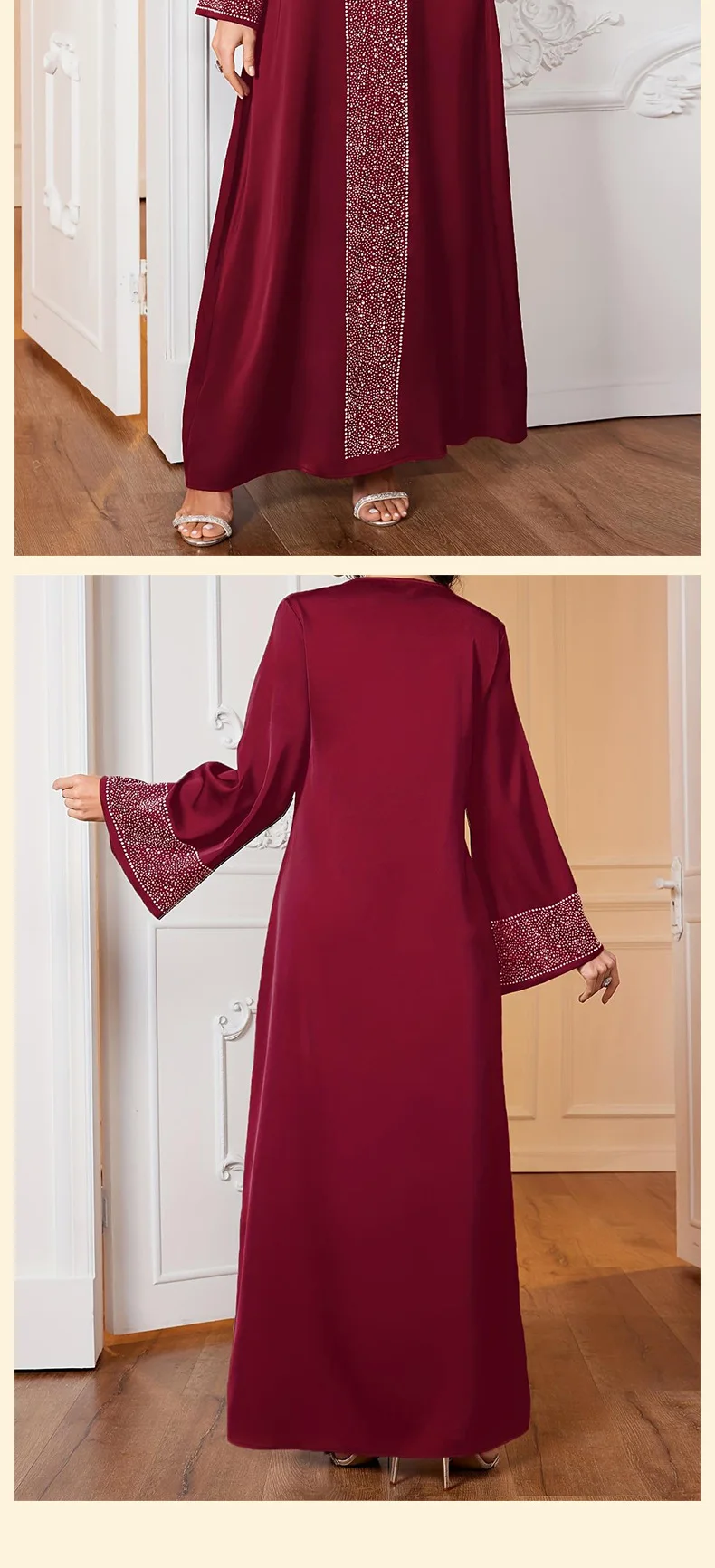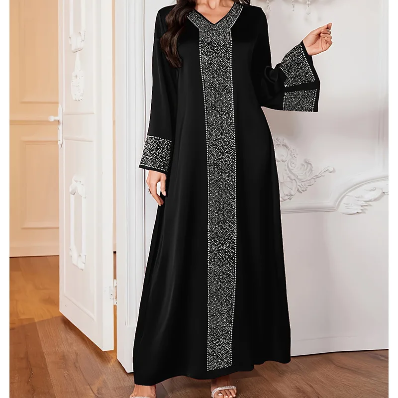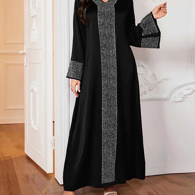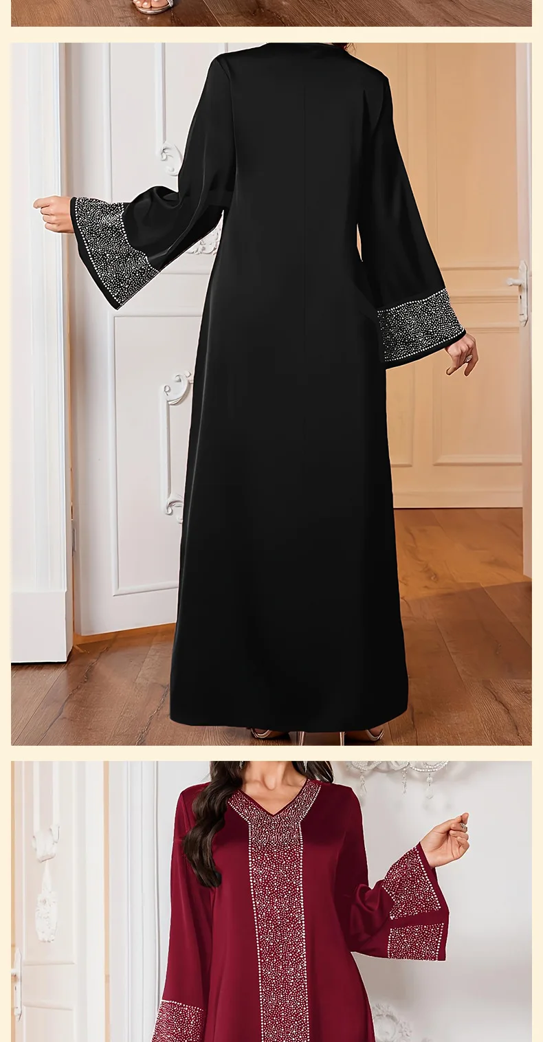 تتميز هذه العباءة بتصميم أنيق على شكل حرف V وأحجار الراين اللامعة، مما يجعلها خيارًا راقيًا لأي مناسبة.