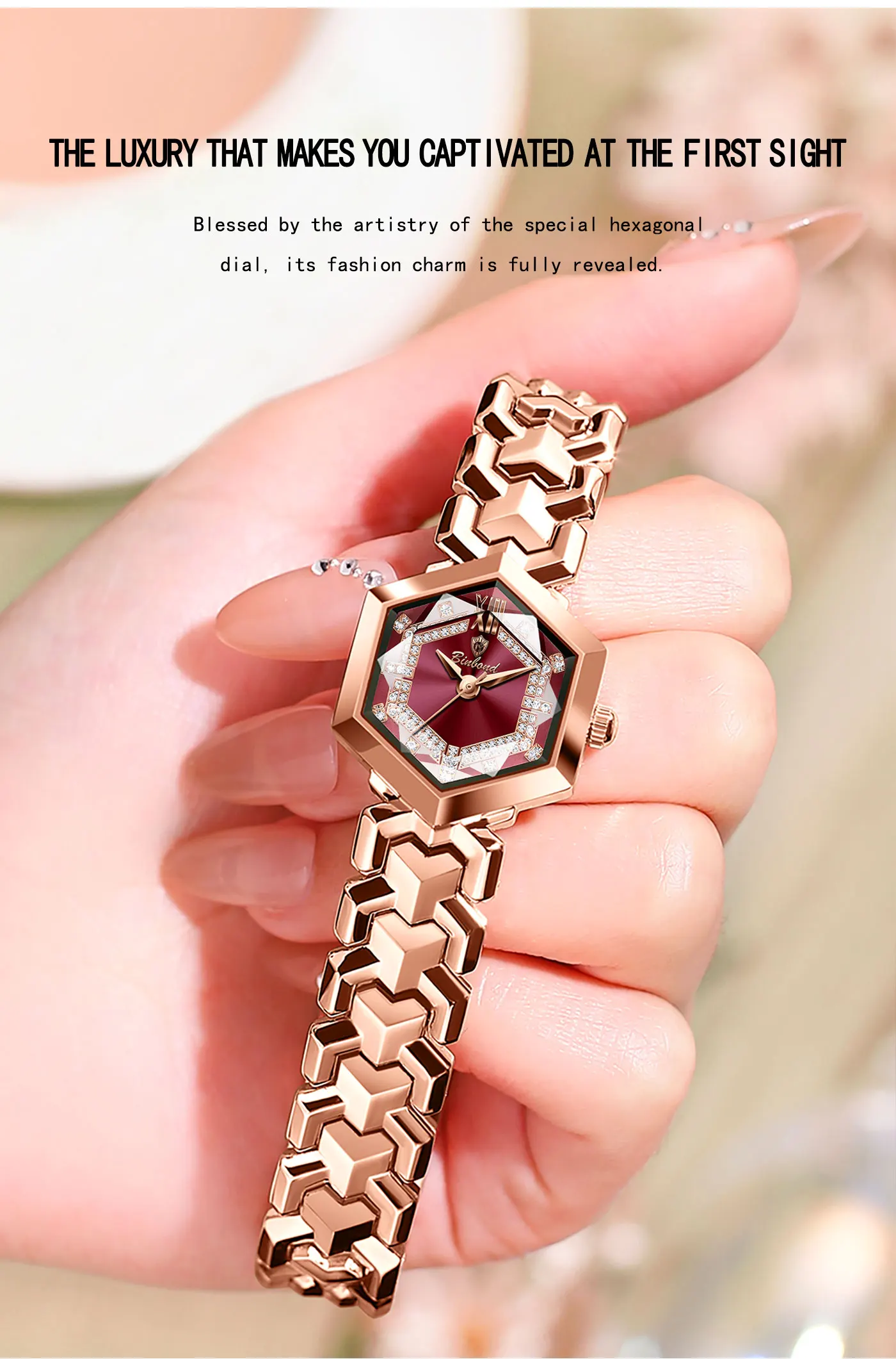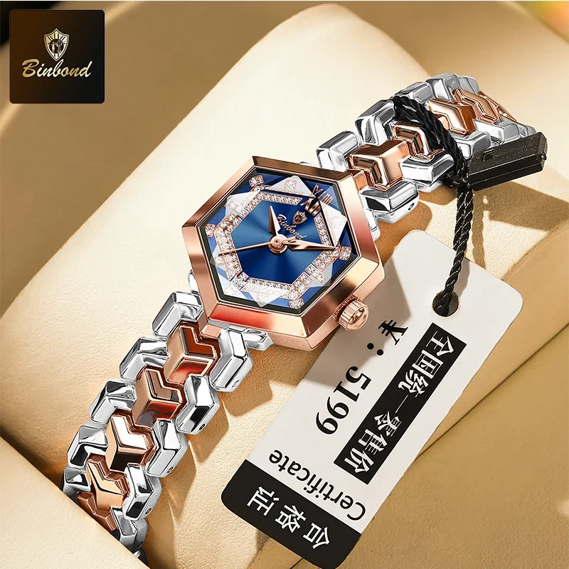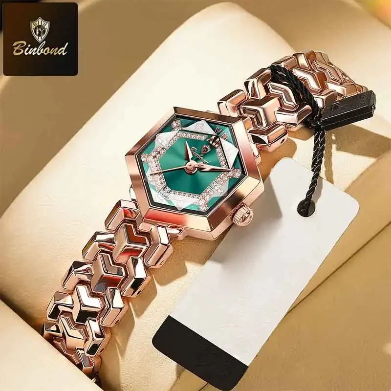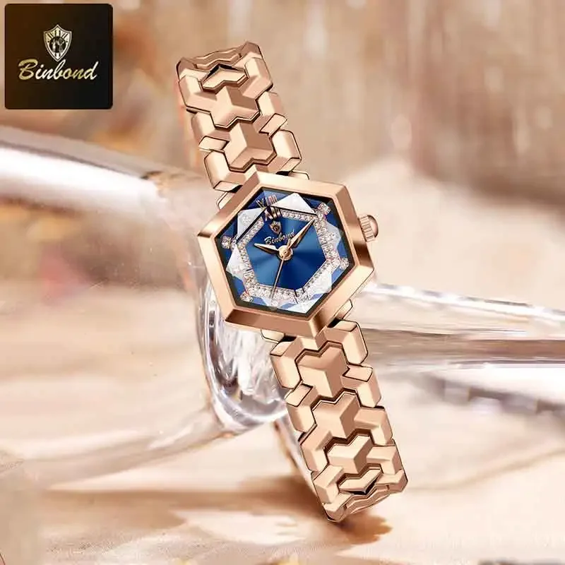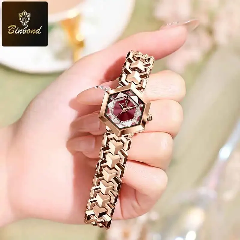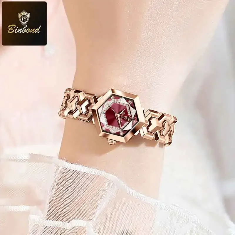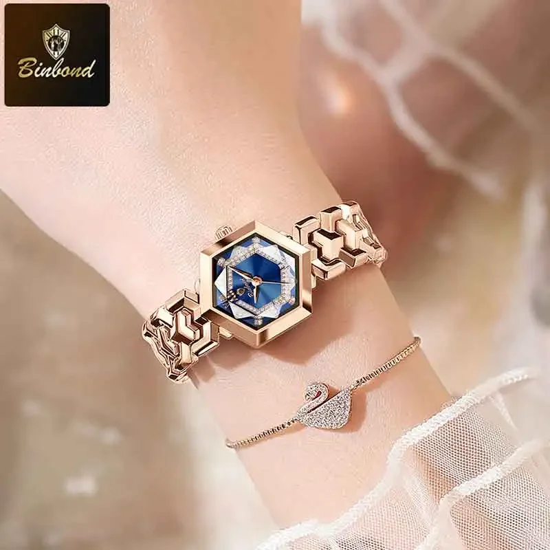 ساعة كوارتز نسائية أنيقة من BINBOND، مرآة معينية مقاومة للماء، ساعة يد ماسية مضيئة، ساعة أصلية للسيدات